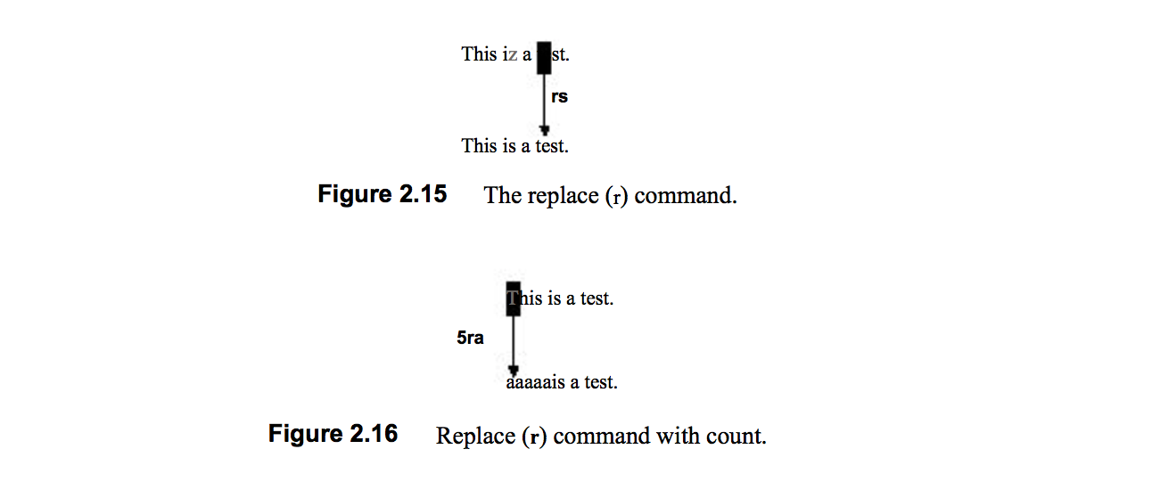 rx 把光标所在的字符替换为x. Figure 2.15展示了怎么使用r命令来把z替换为s
