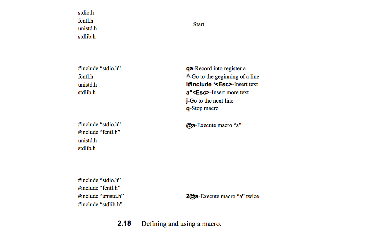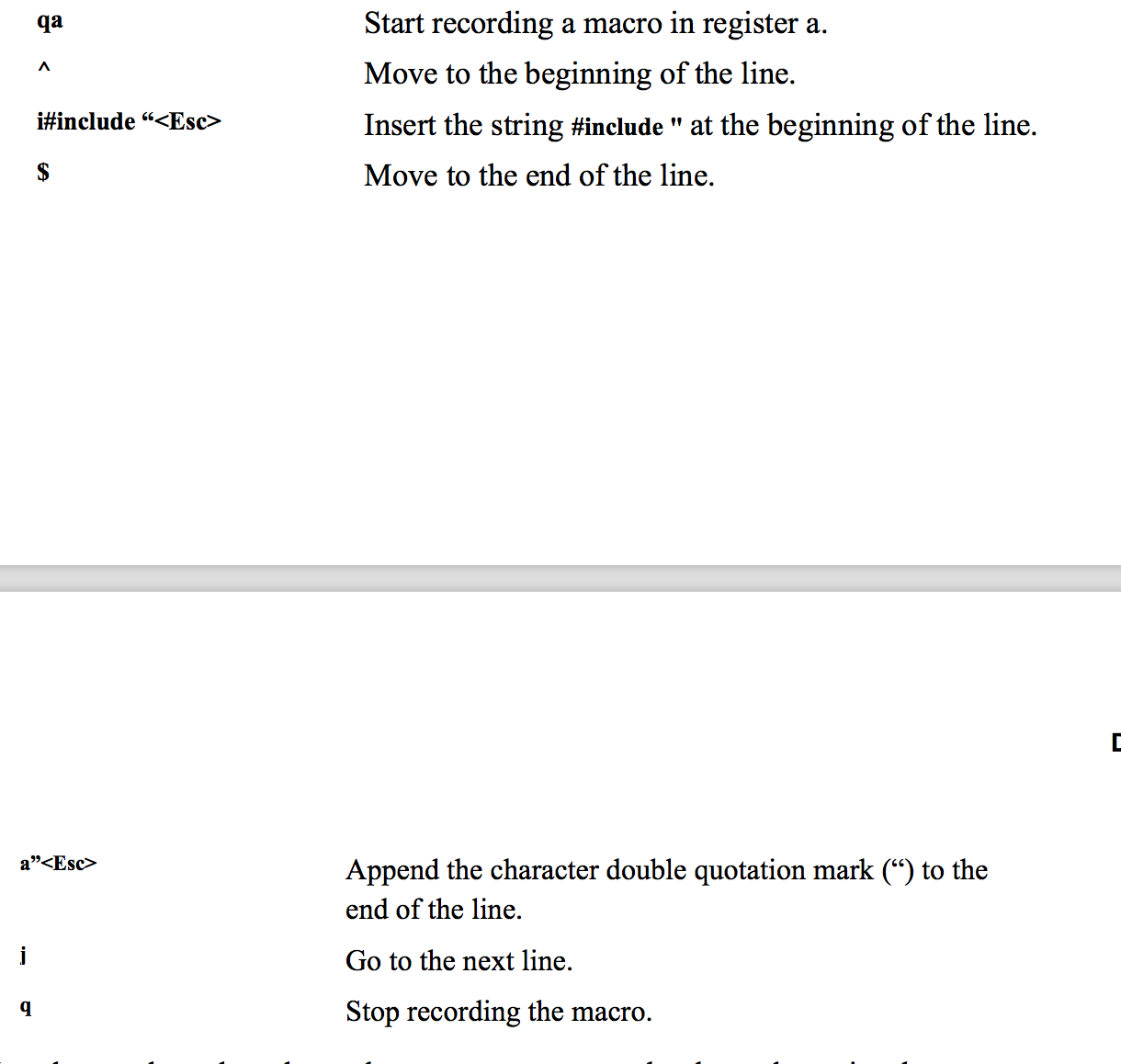 .命令重复前面的更改。但是你想做一些更复杂的动作而不是一个单一的更改?这就是引入按键宏指令的原因。qcharacter以字符(a-z)记录你的击键。